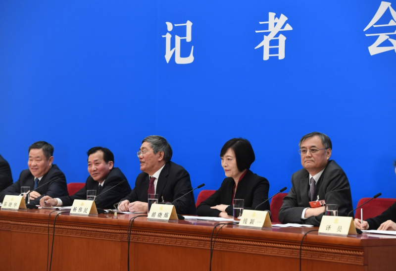 3月8日,全国政协十三届一次会议新闻中心在北京人民大会堂举行记者会,邀请全国政协委员杨伟民、胡晓炼、陈晓华、钱颖一、宁高宁谈推动经济高质量发展。