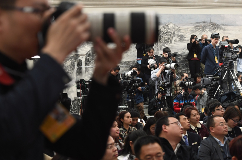 3月8日,全国政协十三届一次会议新闻中心在北京人民大会堂举行记者会,邀请全国政协委员杨伟民、胡晓炼、陈晓华、钱颖一、宁高宁谈推动经济高质量发展。这是记者在现场采访。