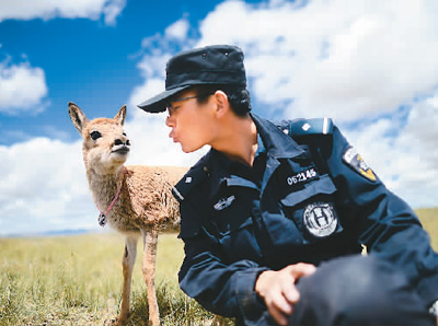 青海玉树藏族自治州可可西里索南达杰保护站协警解安程和小藏羚羊玩耍。新华社记者 张宏祥 摄