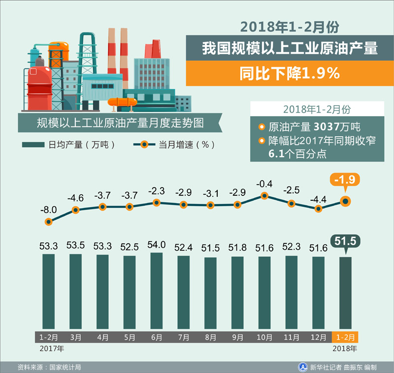 图表:2018年1-2月份我国规模以上工业原油产量同比下降1.9%