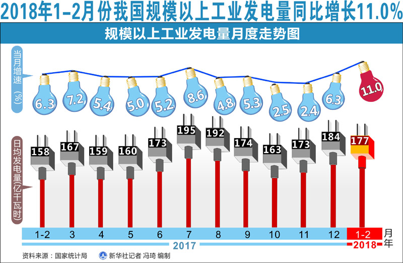 图表:2018年1-2月份我国规模以上工业发电量同比增长11.0%