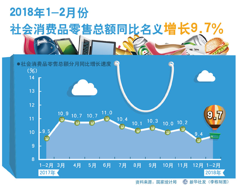 图表:2018年1-2月份社会消费品零售总额同比名义增长9.7%