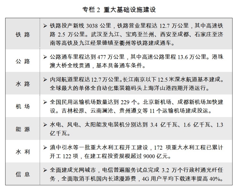 四是基础设施保障水平进一步提升。172项重大水利工程已累计开工122项,其中2017年新开工16项,现代综合交通运输体系加快完善,交通基础设施网络布局不断优化,全年铁路建设完成投资超过8000亿元,公路水路完成投资超过2万亿元,民航完成投资825亿元。多式联运加快发展,集装箱铁水联运量增长20%以上。能源生产和消费革命战略全面实施,能源基础设施网络建设统筹推进。