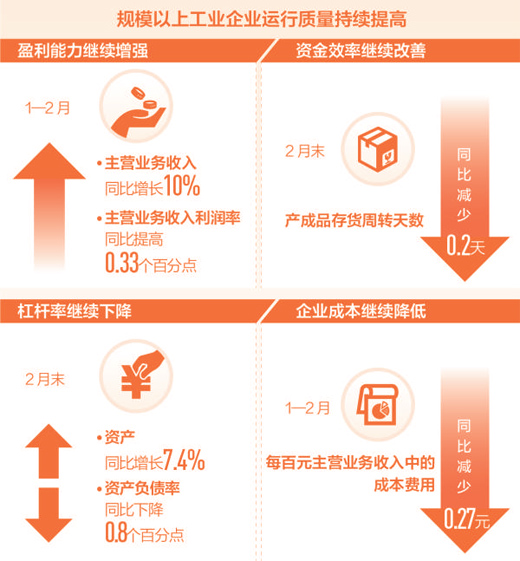资金效率继续改善。2月末,规模以上工业企业产成品存货周转天数为17.4天,同比减少0.2天;应收账款平均回收期为47.4天,同比减少0.2天。