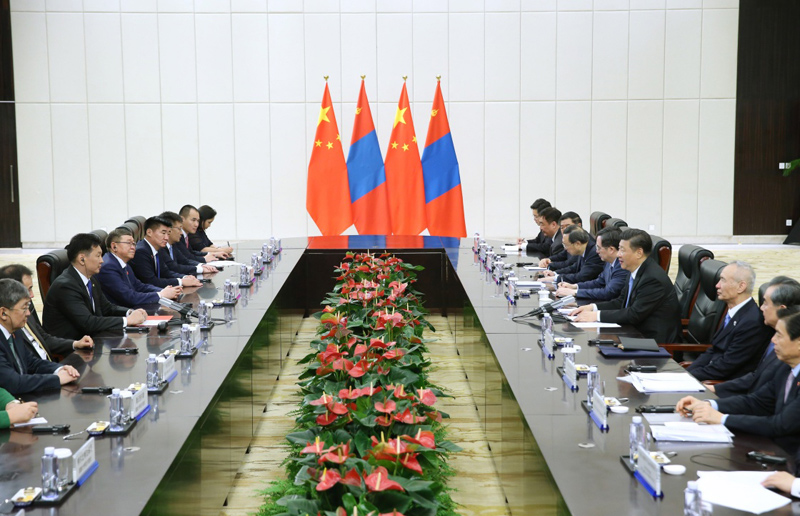 习近平指出,中方始终将中蒙关系放在周边外交重要位置。我们将推动建设人类命运共同体,继续按照亲诚惠容理念和与邻为善、以邻为伴的周边外交方针,深化同蒙古国的关系。当前,中蒙关系处在新的历史阶段。双方要本着互信、合作、共赢原则,抓住机遇,推动中蒙全面战略伙伴关系向前发展。