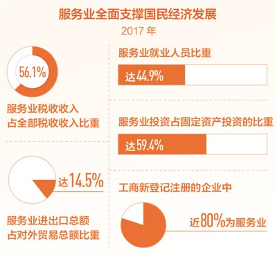 服务业已成为税收的主要来源。2017年,服务业税收收入占全部税收收入比重为56.1%,比上年增长9.9%,连续5年对税收收入贡献过半。