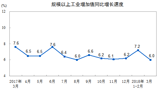 2018年3月份,规模以上工业增加值同比实际增长6.0%(以下增加值增速均为扣除价格因素的实际增长率),比1-2月份回落1.2个百分点。从环比看,3月份,规模以上工业增加值比上月增长0.33%。一季度,规模以上工业增加值同比增长6.8%。