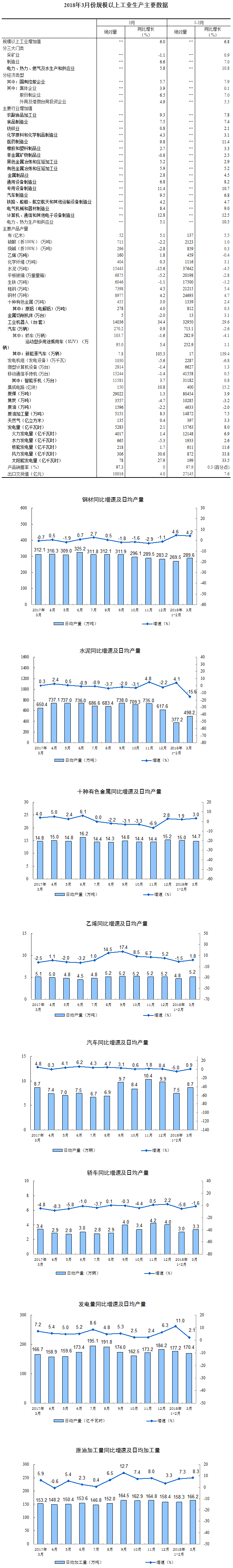分产品看,3月份,596种产品中有336种产品同比增长。其中,钢材8977万吨,同比增长4.2%;水泥15443万吨,下降15.6%;十种有色金属455万吨,增长3.0%;乙烯160万吨,增长1.8%;汽车270.2万辆,增长0.9%;轿车103.7万辆,下降1.6%;发电量5283亿千瓦时,增长2.1%;原油加工量5151万吨,增长8.3%。