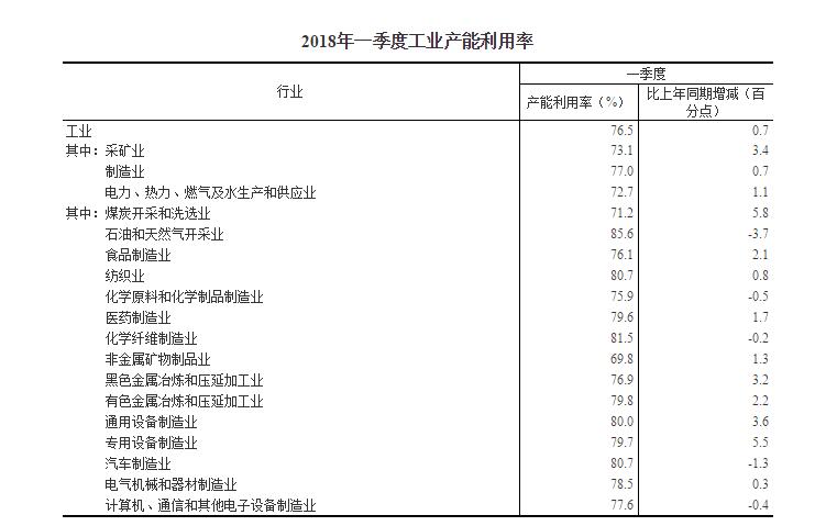 2018年一季度,全国工业产能利用率为76.5%,比上年同期回升0.7个百分点。