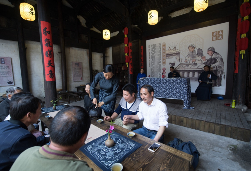 村民们在浙江省桐乡市马鸣村老街的茶馆里聊天聚会(4月23日摄)。