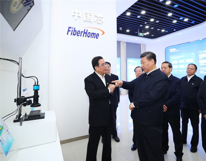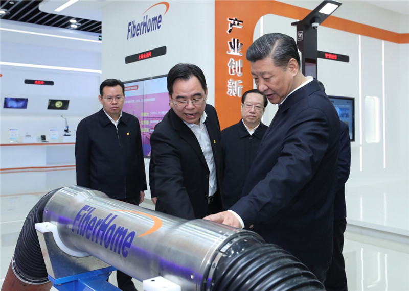 26日上午,习近平在烽火集团有限公司考察时,听取了武汉市新旧动能转换发展情况介绍,察看了公司自主创新产品展示,了解企业转型升级、优化调整产业结构和加强党建工作的情况。习近平对大家说,你们所从事的光通信行业很重要,要建设网络强国,需要你们加快脚步,更快地占领一些制高点。他还指出,武汉高校众多,很有发展潜力,人才在发展中起决定性作用,要把人才队伍建设好。