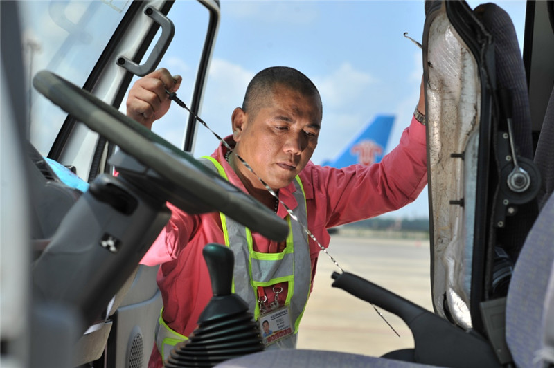 4月29日,在海口美兰机场,飞机排污车司机符世江在对排污车进行使用前的安全检查。