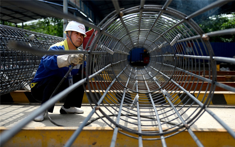 5月1日,中铁七局西安公司工人在西安站改项目工地上焊接钢筋。