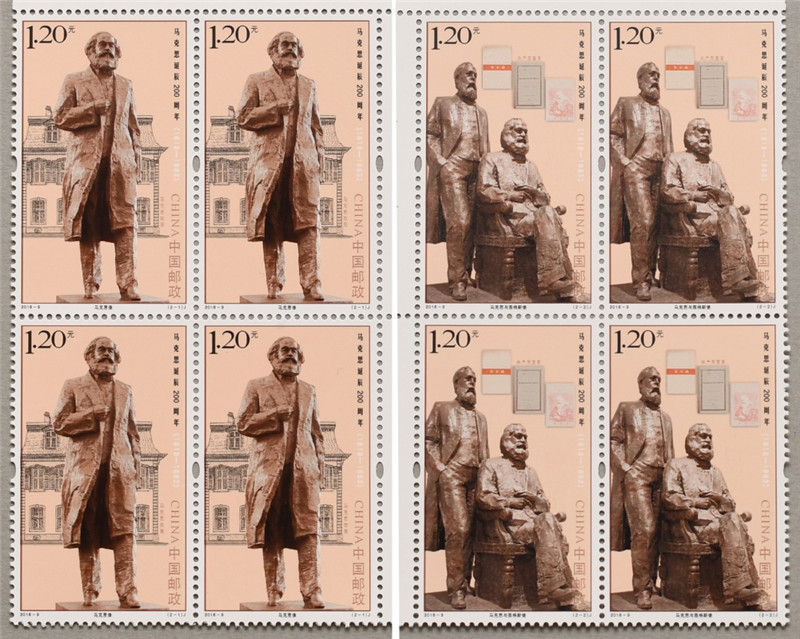 这是《马克思诞辰200周年》纪念邮票(四方联,5月5日摄,拼版照片)。