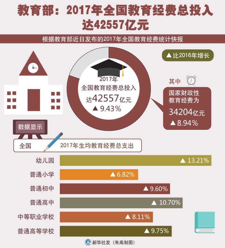 图表:教育部:2017年全国教育经费总投入达42557亿元