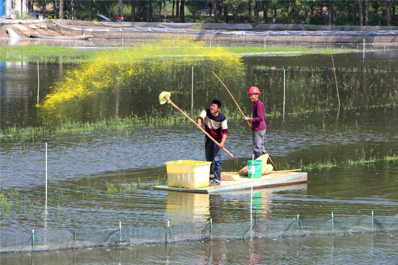 5月9日,在江苏省宝应县子婴河村,农民在蟹塘里调控水质。