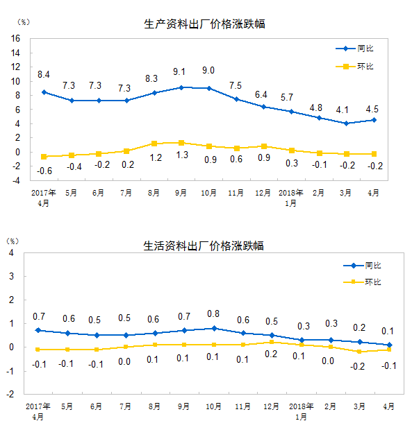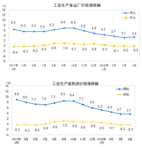 2018年4月份,全国工业生产者出厂价格同比上涨3.4%,环比下降0.2%。工业生产者购进价格同比上涨3.7%,环比下降0.3%。1-4月平均,工业生产者出厂价格同比上涨3.6%,工业生产者购进价格同比上涨4.2%。