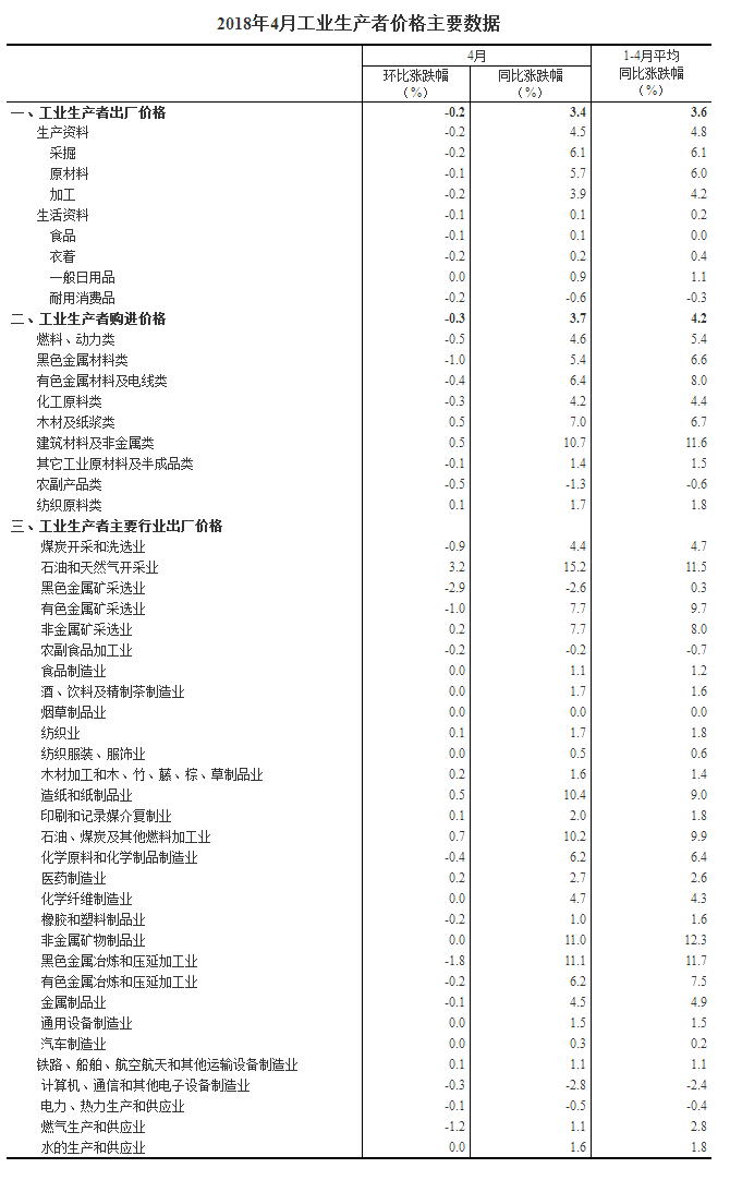 2018年4月份工业生产者出厂价格同比上涨3.4%