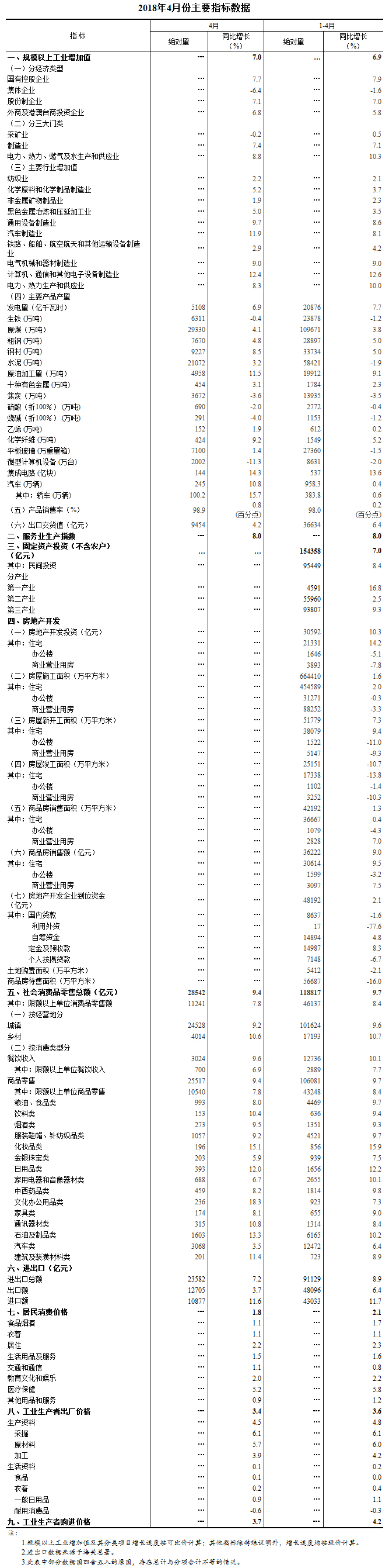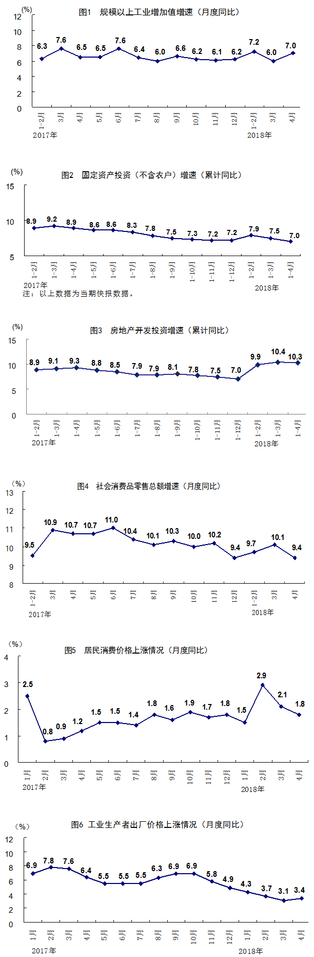 总的来看,4月份国民经济延续了稳中有进、稳中向好的发展态势。但也要看到,外部环境不稳定不确定因素增加,国内发展不平衡不充分问题突出,经济持续健康发展的基础仍需巩固。要以习近平新时代中国特色社会主义思想为指导,深入贯彻党的十九大和中央经济工作会议精神,按照政府工作报告部署,坚持稳中求进工作总基调,以供给侧结构性改革为主线,保持宏观政策的连续性和稳定性,坚持扩大改革开放,深入实施创新驱动,不断增强内生动力,着力振兴实体经济,推动我国经济在实现高质量发展上不断取得新进展。