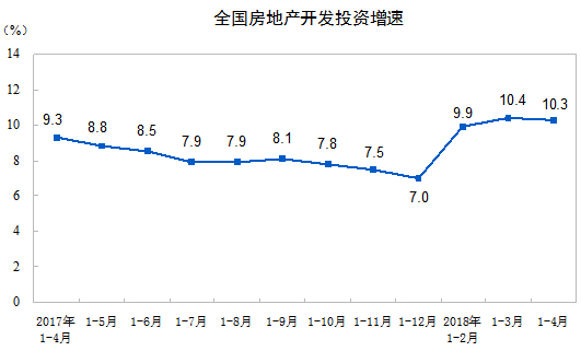 2018年1-4月份,全国房地产开发投资30592亿元,同比名义增长10.3%,增速比1-3月份回落0.1个百分点。其中,住宅投资21331亿元,增长14.2%,增速提高0.9个百分点。住宅投资占房地产开发投资的比重为69.7%。