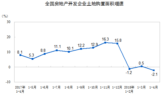 1-4月份,房地产开发企业土地购置面积5412万平方米,同比下降2.1%,1-3月份为增长0.5%;土地成交价款2391亿元,增长13.6%,增速回落6.7个百分点。