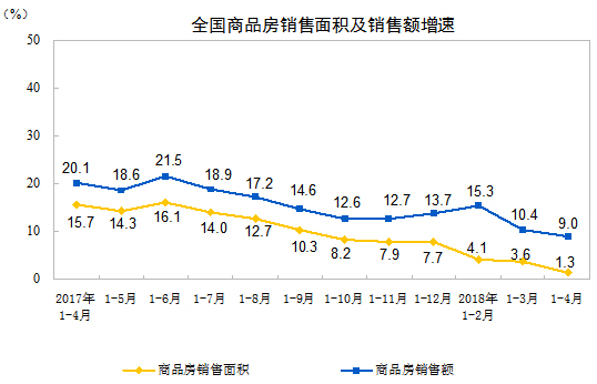 1-4月份,商品房销售面积42192万平方米,同比增长1.3%,增速比1-3月份回落2.3个百分点。其中,住宅销售面积增长0.4%,办公楼销售面积下降4.3%,商业营业用房销售面积增长7.0%。商品房销售额36222亿元,增长9.0%,增速回落1.4个百分点。其中,住宅销售额增长9.5%,办公楼销售额下降3.2%,商业营业用房销售额增长7.5%。