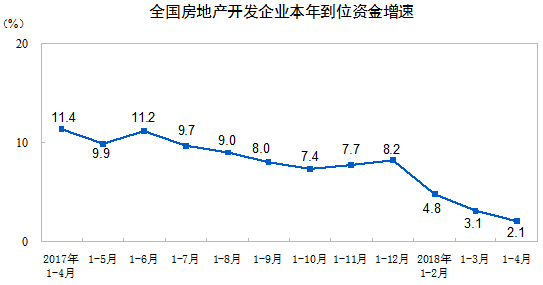 1-4月份,房地产开发企业到位资金48192亿元,同比增长2.1%,增速比1-3月份回落1个百分点。其中,国内贷款8637亿元,下降1.6%;利用外资17亿元,下降77.6%;自筹资金14894亿元,增长4.8%;定金及预收款14987亿元,增长8.3%;个人按揭贷款7148亿元,下降6.7%。