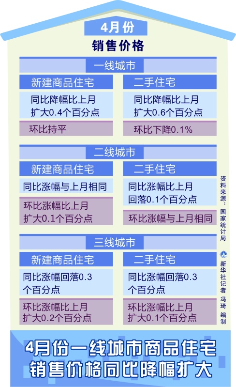 图表:4月份一线城市商品住宅销售价格同比降幅扩大