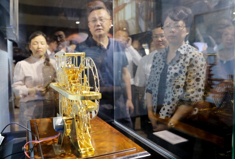 5月16日,参观者在一个仿水运仪机械装置前驻足观看。