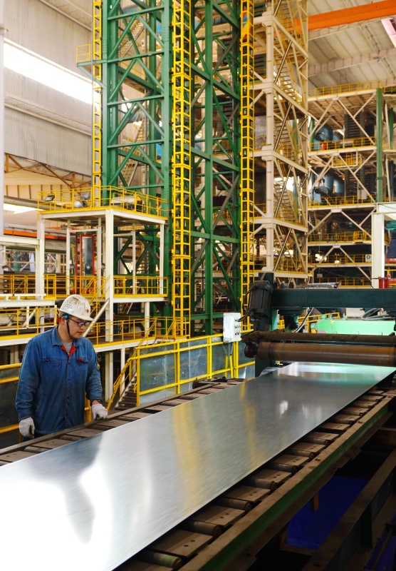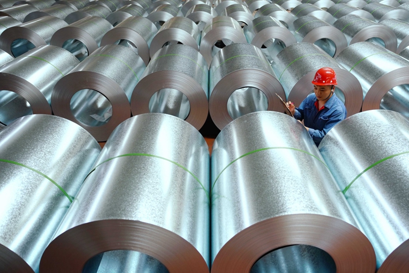 5月29日,唐山市海港开发区一家镀锌钢板生产企业的质检员在检查产品质量。