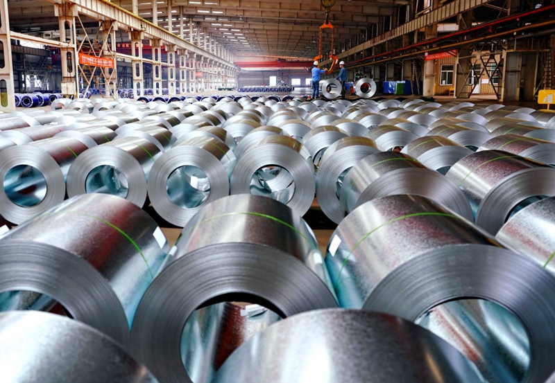 5月29日,唐山市海港开发区一家镀锌钢板生产企业的工人在吊运刚生产的钢板。