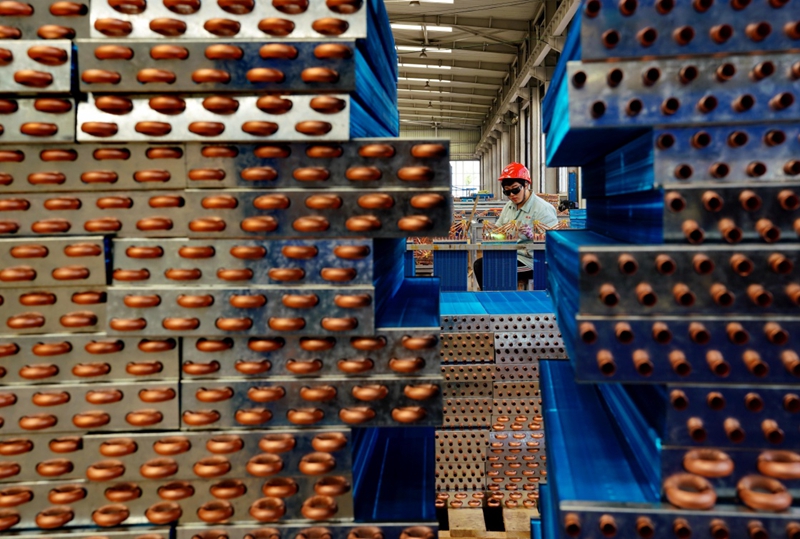 5月29日,工人在唐山市海港开发区一家空气源热泵生产企业的生产线上工作。