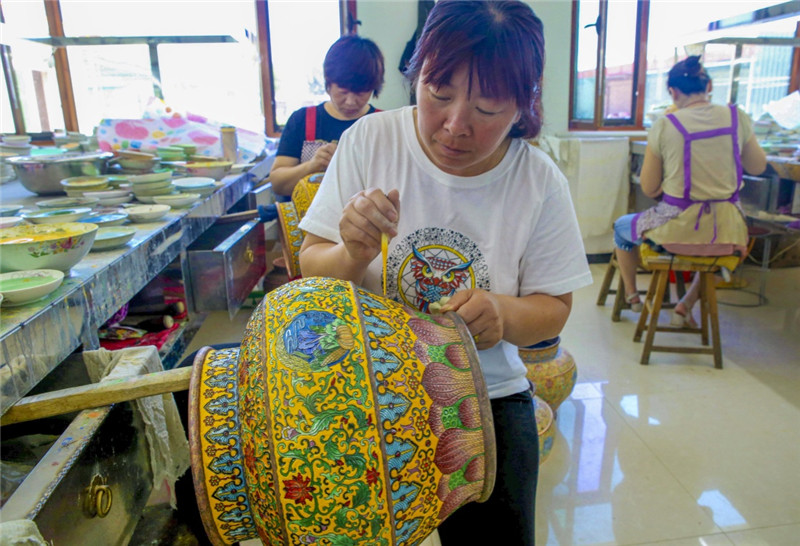河北省饶阳县亿泽工艺品厂是一家纯手工景泰蓝制作企业。近年来,该企业重点招收了数百人次农村妇女在农闲时节走进车间就业,既能增加家庭收入,还将她们培养成景泰蓝制作的专业人才。