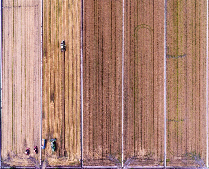 6月2日,收割机在江苏省泰州市红旗良种场田间收割小麦(无人机拍摄)。