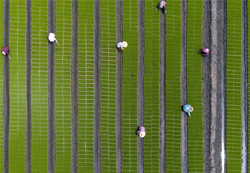 6月2日,江苏省泰州市红旗良种场员工在培育秧亩(无人机拍摄)。