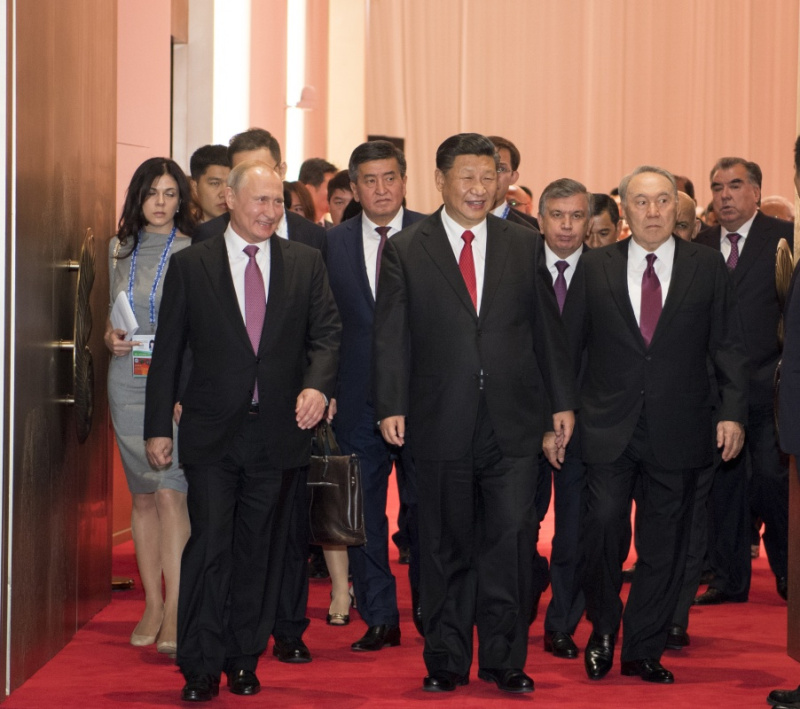 6月9日,国家主席习近平在青岛国际会议中心举行宴会,欢迎出席上海合作组织青岛峰会的外方领导人。这是习近平同贵宾们共同步入宴会厅。新华社记者 李学仁 摄