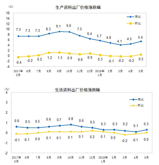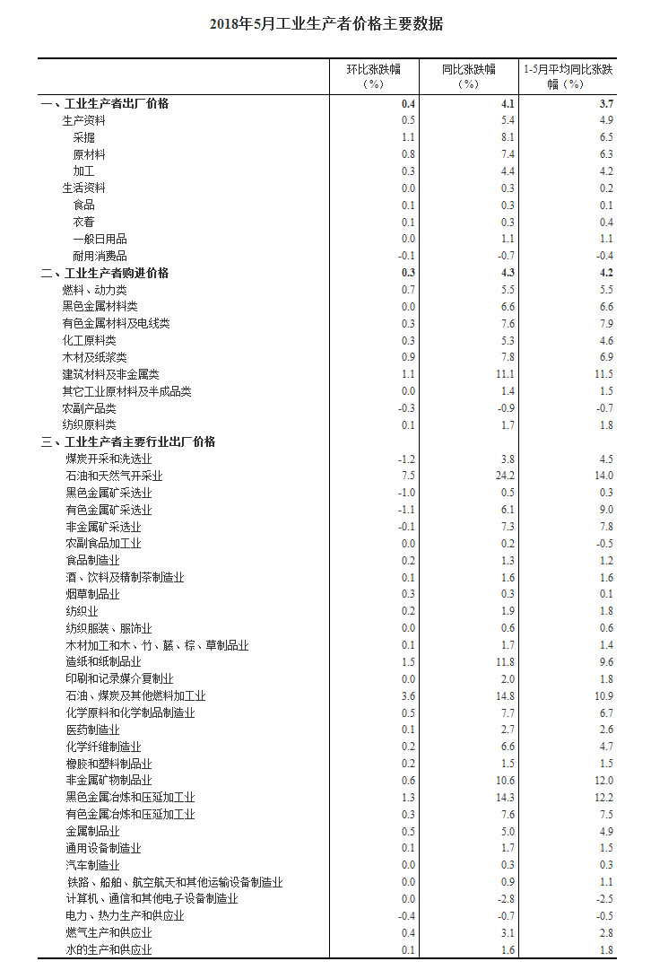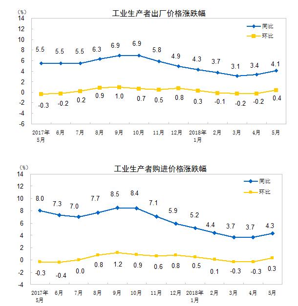 2018年5月份,全国工业生产者出厂价格同比上涨4.1%,环比上涨0.4%。工业生产者购进价格同比上涨4.3%,环比上涨0.3%。1-5月平均,工业生产者出厂价格比去年同期上涨3.7%,工业生产者购进价格上涨4.2%。