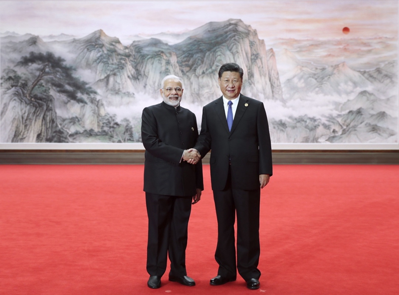 6月10日,上海合作组织成员国元首理事会第十八次会议在青岛国际会议中心举行。中国国家主席习近平主持会议并发表重要讲话。这是小范围会谈前,习近平在迎宾厅迎接印度总理莫迪。新华社记者 谢环驰 摄