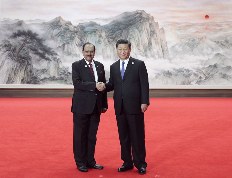 6月10日,上海合作组织成员国元首理事会第十八次会议在青岛国际会议中心举行。中国国家主席习近平主持会议并发表重要讲话。这是小范围会谈前,习近平在迎宾厅迎接巴基斯坦总统侯赛因。新华社记者 谢环驰 摄