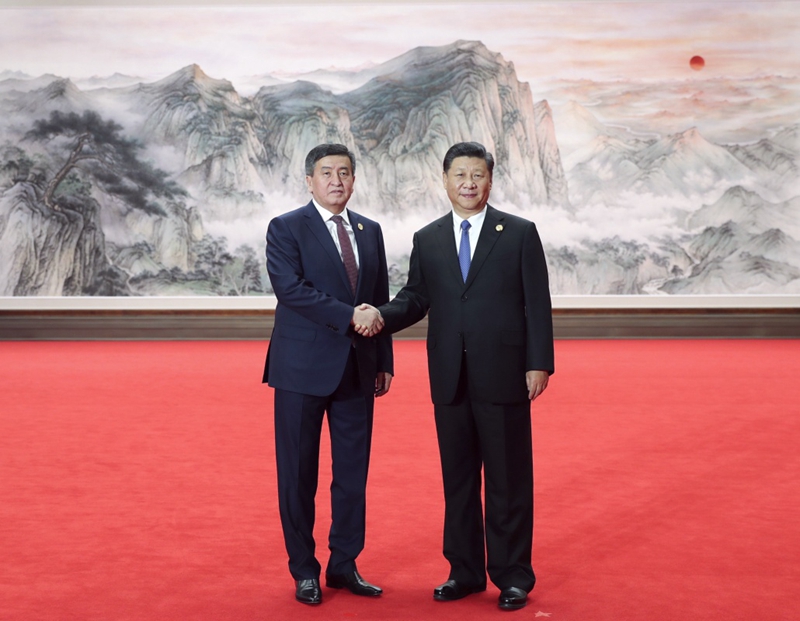 6月10日,上海合作组织成员国元首理事会第十八次会议在青岛国际会议中心举行。中国国家主席习近平主持会议并发表重要讲话。这是小范围会谈前,习近平在迎宾厅迎接吉尔吉斯斯坦总统热恩别科夫。新华社记者 谢环驰 摄