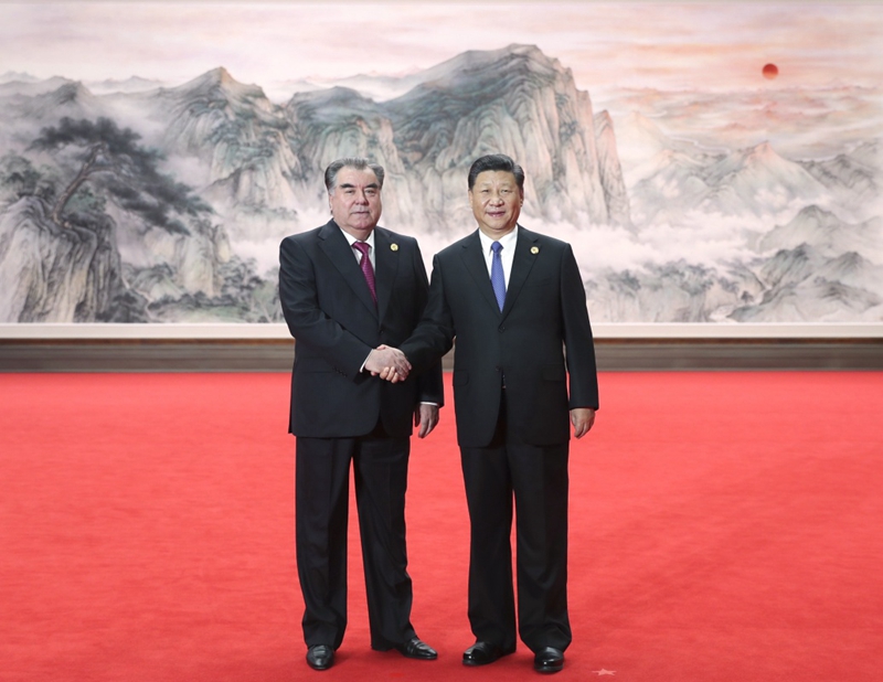 6月10日,上海合作组织成员国元首理事会第十八次会议在青岛国际会议中心举行。中国国家主席习近平主持会议并发表重要讲话。这是小范围会谈前,习近平在迎宾厅迎接塔吉克斯坦总统拉赫蒙。新华社记者 谢环驰 摄