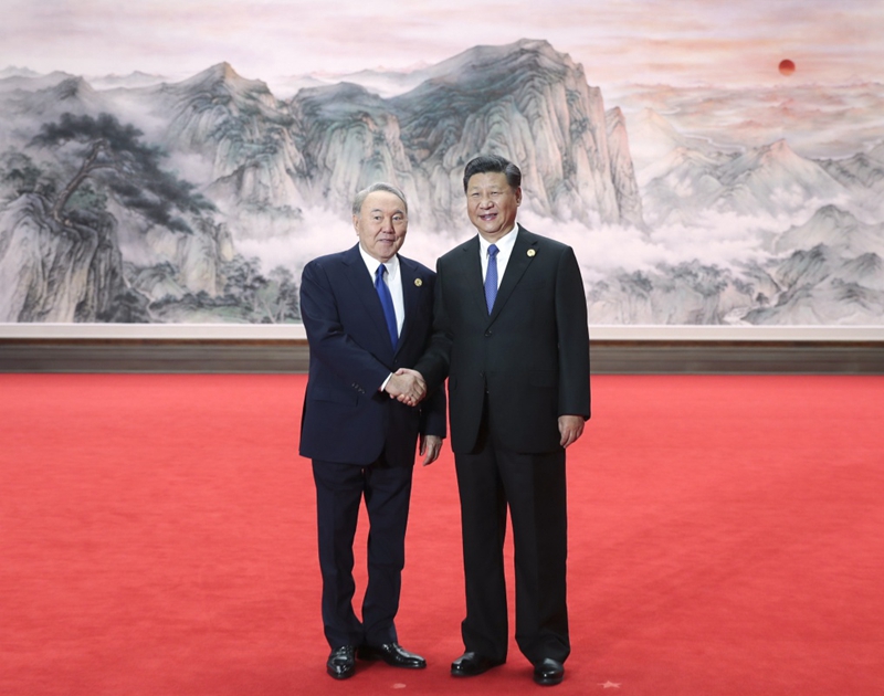 6月10日,上海合作组织成员国元首理事会第十八次会议在青岛国际会议中心举行。中国国家主席习近平主持会议并发表重要讲话。这是小范围会谈前,习近平在迎宾厅迎接哈萨克斯坦总统纳扎尔巴耶夫。新华社记者 谢环驰 摄