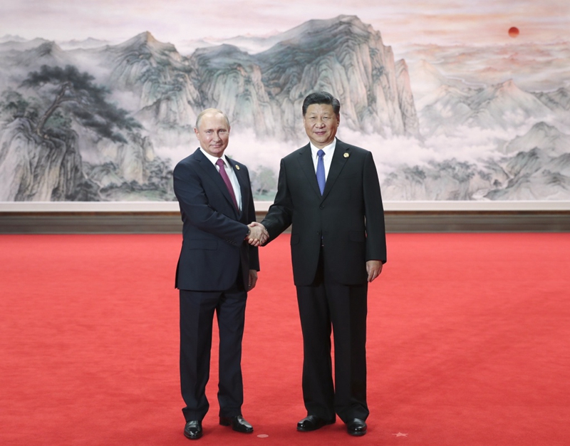 6月10日,上海合作组织成员国元首理事会第十八次会议在青岛国际会议中心举行。中国国家主席习近平主持会议并发表重要讲话。这是小范围会谈前,习近平在迎宾厅迎接俄罗斯总统普京。新华社记者 谢环驰 摄