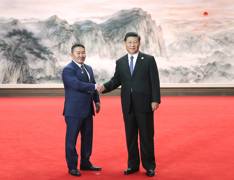 6月10日,上海合作组织成员国元首理事会第十八次会议在青岛国际会议中心举行。中国国家主席习近平主持会议并发表重要讲话。这是会前,习近平在迎宾厅迎接蒙古国总统巴特图勒嘎。新华社记者 谢环驰 摄