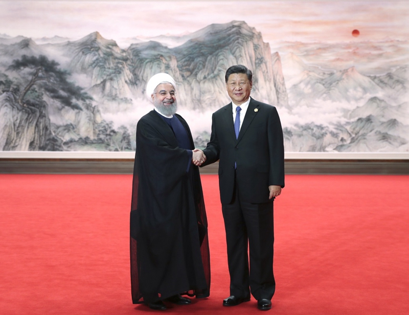 6月10日,上海合作组织成员国元首理事会第十八次会议在青岛国际会议中心举行。中国国家主席习近平主持会议并发表重要讲话。这是会前,习近平在迎宾厅迎接伊朗总统鲁哈尼。新华社记者 谢环驰 摄