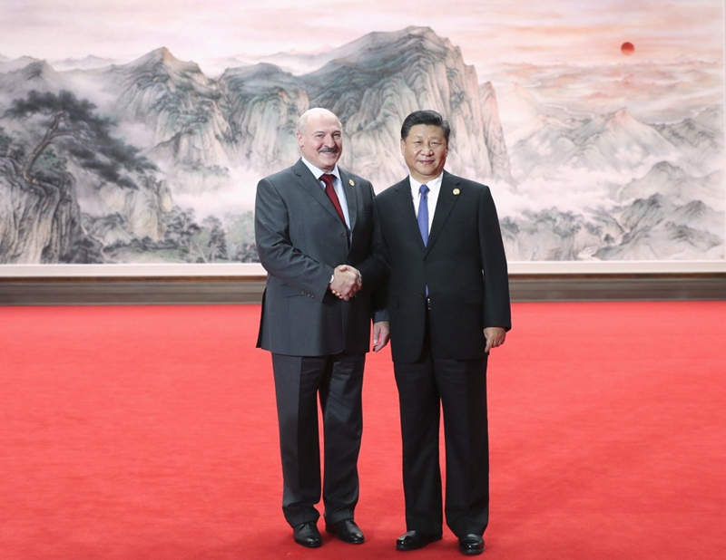 6月10日,上海合作组织成员国元首理事会第十八次会议在青岛国际会议中心举行。中国国家主席习近平主持会议并发表重要讲话。这是会前,习近平在迎宾厅迎接白俄罗斯总统卢卡申科。新华社记者 谢环驰 摄