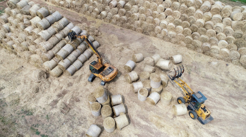 6月11日,在山东省临沂市郯城县郯城街道三井村秸秆回收中心,工人驾驶抓草机整理回收的小麦秸秆(无人机拍摄)。