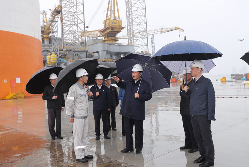 6月13日下午,习近平冒雨来到中集来福士海洋工程有限公司烟台基地。“蓝鲸1号”钻井平台巍峨伫立、“泰山”龙门吊高耸入云,习近平撑着伞边走边看,详细了解企业走自主创新发展之路、开展高端海洋工程设备自主设计研发制造情况。听说“蓝鲸1号”去年创造了可燃冰开采时间和产量两项世界纪录,习近平鼓励他们继续努力。总书记同现场的工人们一一握手,他说,基础的、核心的东西是讨不来买不来的,要靠我们自力更生、自主创新来实现。我看你们有这个信心,希望你们迎难而上、再接再厉。(记者 张晓松、谢环驰)