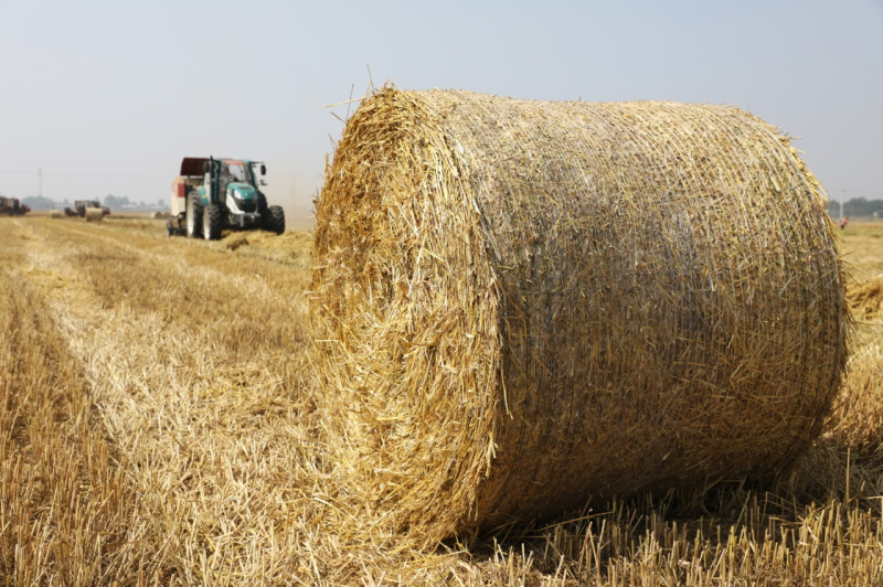 6月14日,在河北省行唐县只里乡北高里村,工人驾驶机械将秸秆打包回收。