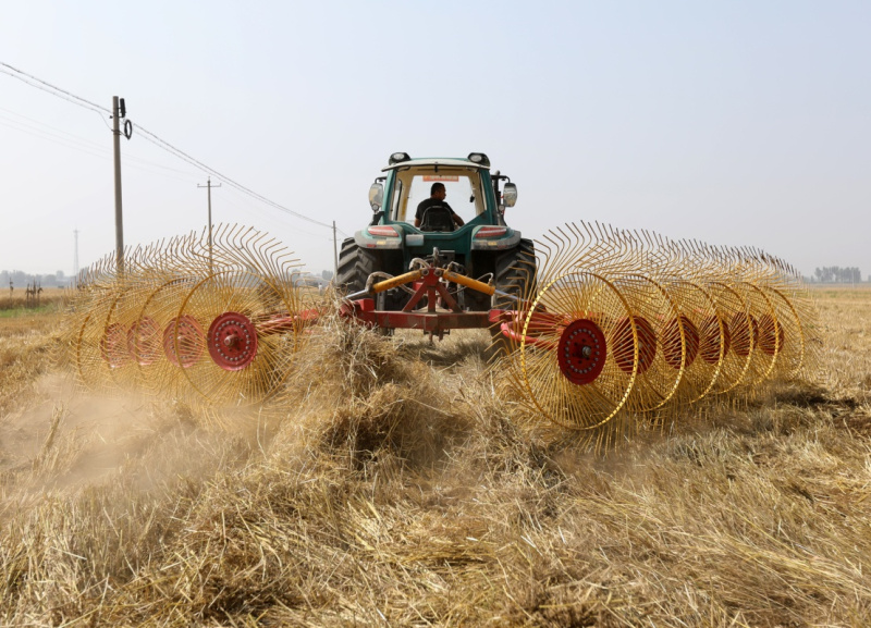 6月14日,在河北省行唐县只里乡北高里村,工人驾驶搂草机将秸秆打包回收。